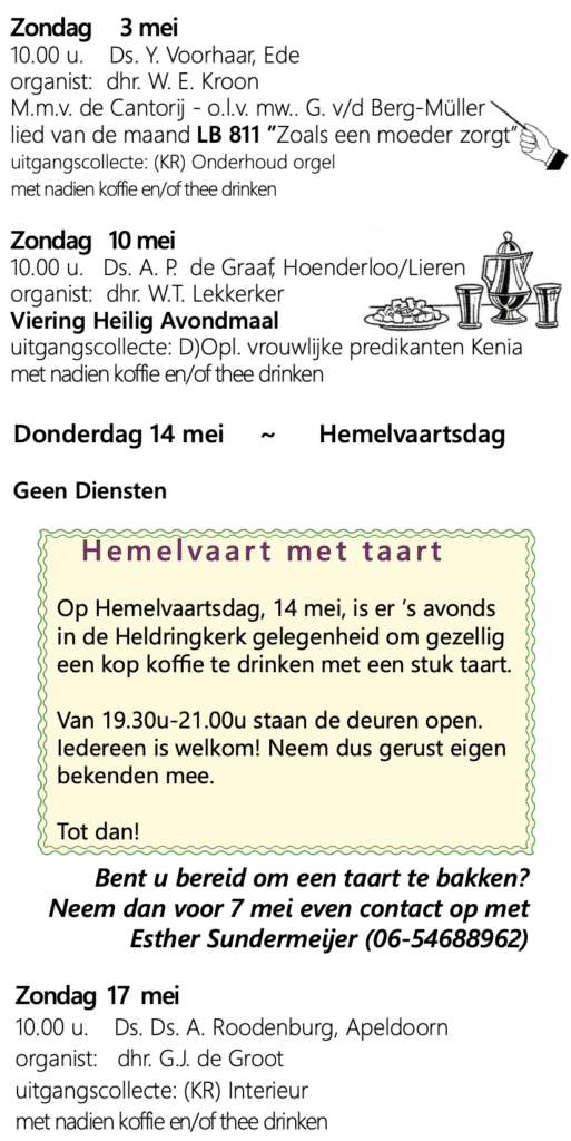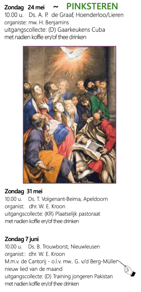 Op zondag begint de dienst om 10:00 uur. Online kunt u de dienst live volgen of terugkijken via Kerkdienstgemist.nl. U kunt daar ook naar de Agenda voor een overzicht van alle diensten.